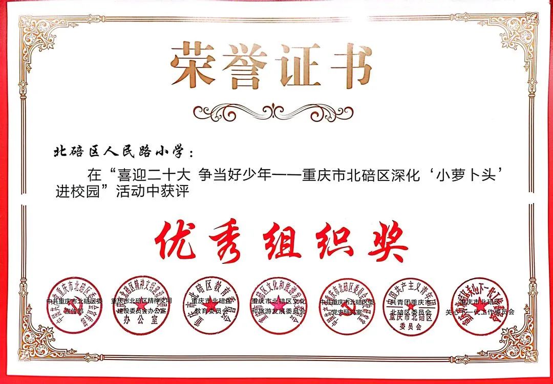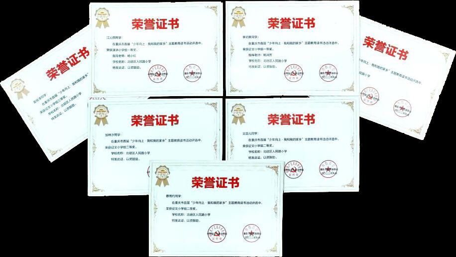 学生在参加重庆市首届“少年向上·我和我的家乡”主题教育活动中有2人荣获少年提案优胜奖,3人荣获小记者采访优胜奖。学校在“喜迎二十大 争当好少年——深化小萝卜头进校园”活动中荣获优秀组织奖。