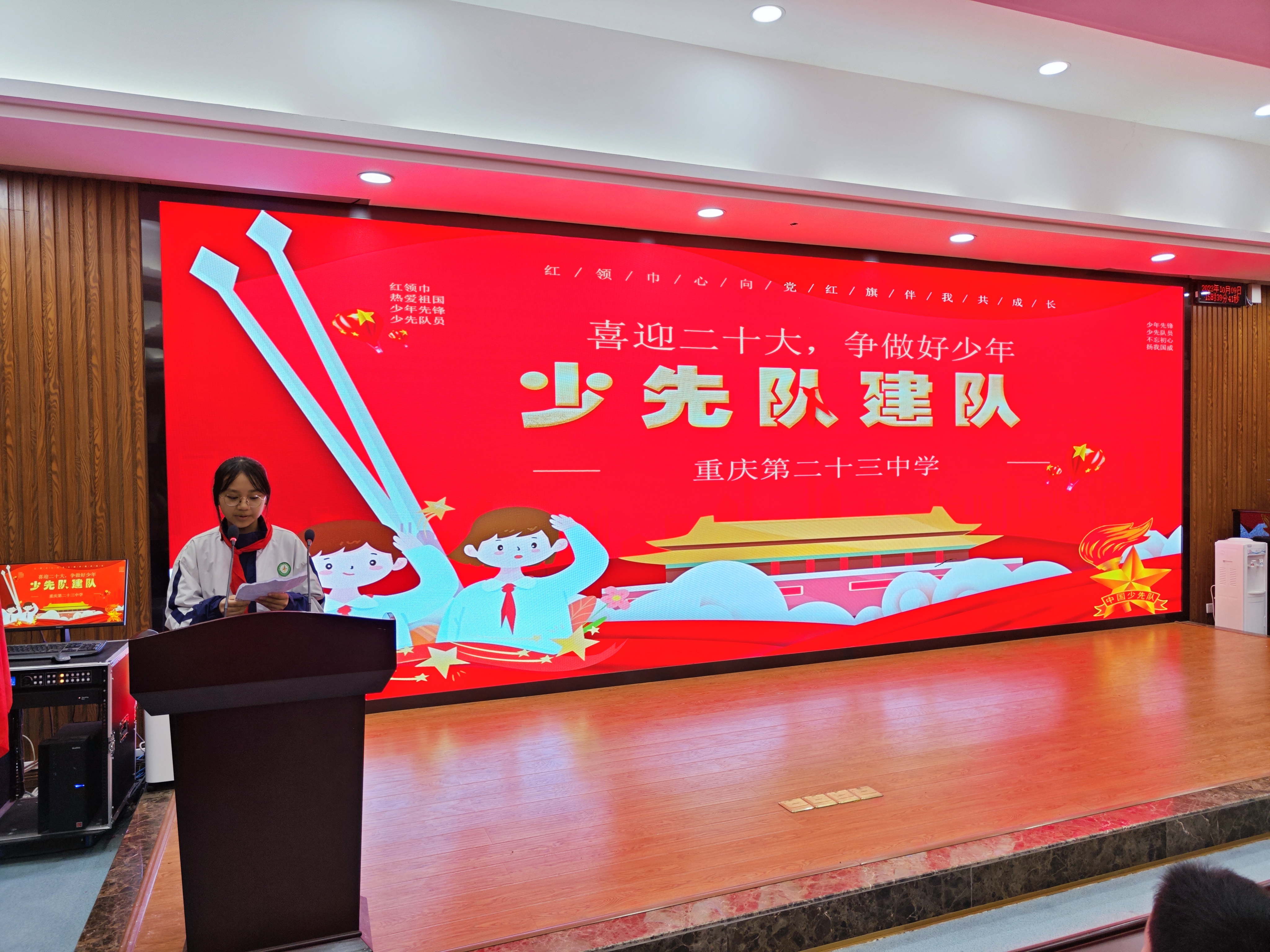 今年的10月13日,是中国少年先锋队建队74周年纪念日,为培育和弘扬“立民族之根、铸爱国之魂”的民族精神,进一步增强少先队员的光荣感、使命感和责任感。重庆第二十三中学校于10月9日下午,成立了初一年级少先队大队,并且还组织开展了”学习二十大,永远跟党走,奋进新征程”主题建队日活动,带领全体同学重温入队时刻。