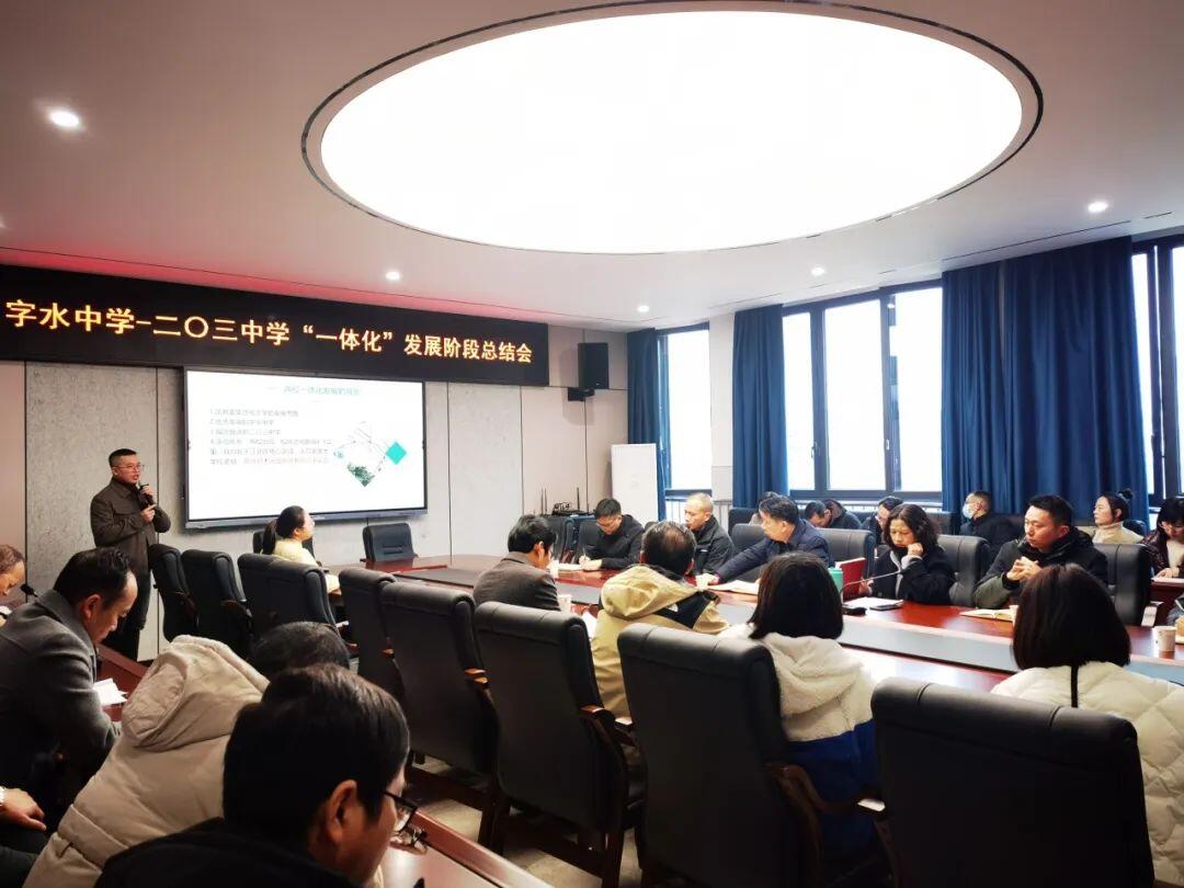 两校“一体化”发展阶段工作要点:一是定战略、谋发展。两校校领导经过多次研讨,定下“一体化”发展的战略规划。2023年6月15日,在教委邱凛副主任的见证下,在字水中学何其芳厅正式对外举行“一体化”发展方案发布会,并公布二〇三中学首届字水班任课教师。二是重落地、优过程。落实是一切工作的生命线。有了规划,需重落地、优过程。在本学期,“一体化”发展落地了字水班项目、教师交流项目、教师培训项目、干部培养项目、教研合作项目等。三是找不足、重优化。知不足而奋进,望远山而力行。在“一体化”发展过程中,还存在项目铺开速度慢,推进深度浅;“一体化”受众面窄,二〇三中学积极主动性还需加强;创新意识不够,工作固态化等问题,在下个阶段的工作中,要找准症结,拿出办法,更快更准更深得地推进两校“一体化”发展工作。